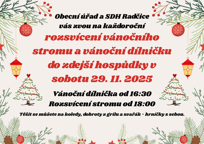 Obecní úřad Radčice a SDH Radčice Vás zvou na každoroční rozsvícení vánočního stromu. V sobotu 29.11. 2025 se můžete s dětmi zúčastnit malé vánoční dílničky od 16:30 v místním pohostinství a následně v 18:00 rozsvítíme náš vánoční strom. Koledy, dobroty z grilu a svařák pro malé i velké bude připraven na místě. Hrníčky s sebou.
